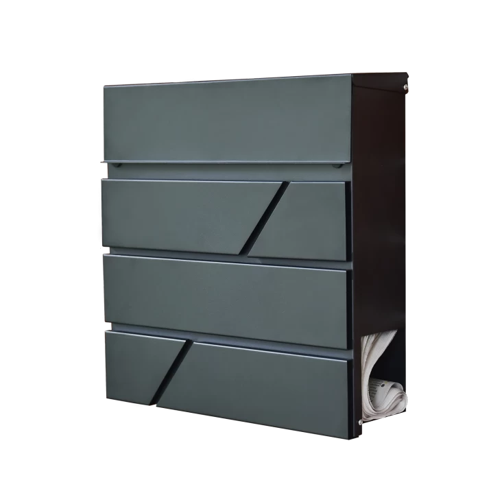 Made from galvanised steel, and complete in a black finish. This post box features a unique design, with four front panels, interrupted by a sleek cut-out. This separates the lockable front from the lid which can be opened to place your post inside. There is also a newspaper holder embedded into the design towards the bottom of the post box, covering all of your potential needs. Complete with a spare set of keys, you can be reassured that your post will be safely stored away.