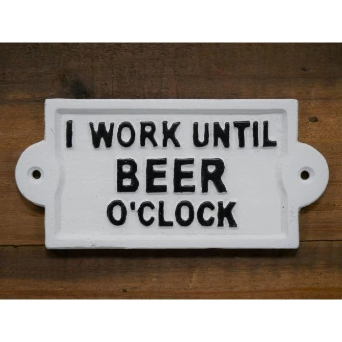 Finished in white, this quirky sign has been handcrafted from robust cast iron and would look perfect within any home office, bar, or entertainment setting. Featuring contrasted black ‘I WORK UNTIL BEER O’CLOCK’ lettering adorning its front, this sign has been specifically designed for wall mounting and will add ample personality to your space for many years to come. Complete with two pre-drilled fixing holes for easy installation.