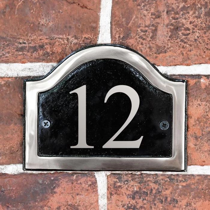 The perfect way to add style and practicality to the exterior of your home, this simple house number sign has been crafted from robust aluminium and finished in a sleek midnight black. Complete with a contrasting bright chrome trim, this arched sign can be personalised with your choice of chrome numbers, which have been crafted from vinyl to ensure longevity. Designed for wall mounting, this sign comes complete with two pre-drilled screw holes and would look ideal placed beside a door or entryway.