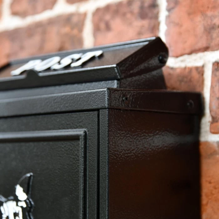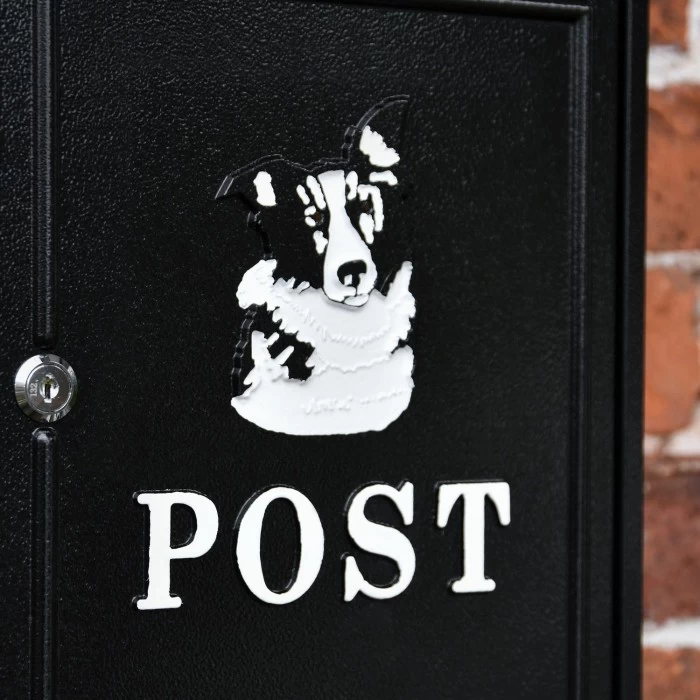 Our Black & White “Oxford” Border Collie Post Box is manufactured by hand using galvanised steel and hand cast aluminium detailing to the door and letter flap. All finished in a black powder coat paint with a black and white, hand-painted Border Collie motif.