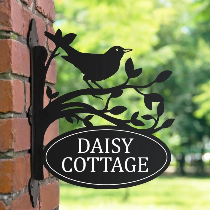 As if pictured about to take off, this blackbird stands perched upon a branch surrounded by other branches and leaves. Crafted from high quality grade steel and finished in a sleek midnight black powder coated finish, for sustainability outside, this house name sign is ideal home accessory for the nature enthusiast. The oval designed house sign can include any house name, street name or surname for ultimate personalisation. This house name sign comes complete with integrated wall mounted bracket which includes pre-drilled holes for easy installation to the desired location. To be in keeping with the overall design, this house sign name is only available in white vinyl in the Cambria font.