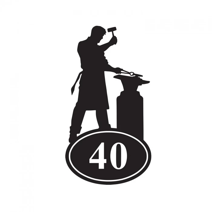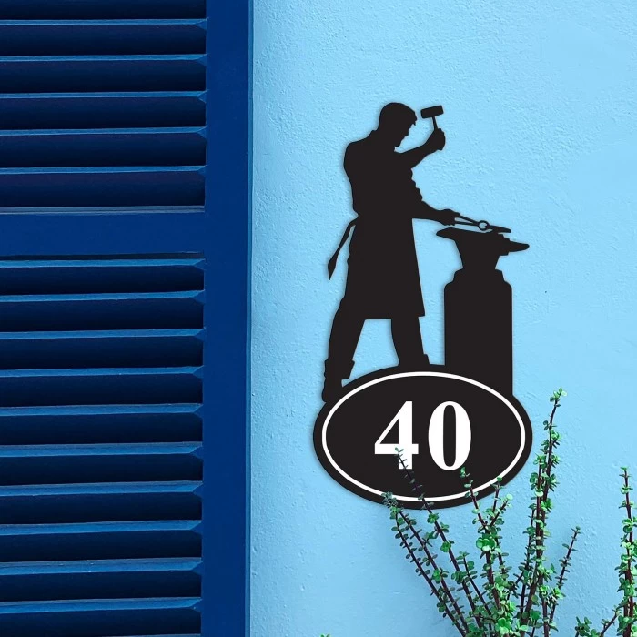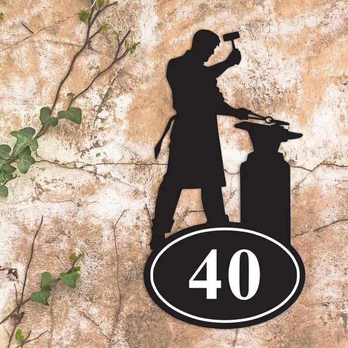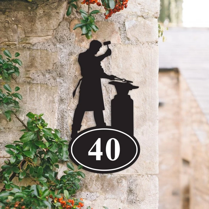 Featuring the silhouette of a blacksmith as he hammers iron on his anvil, this quirky house number sign is the perfect way to add personality to any home or commercial property. Handcrafted from iron and finished in a sleek midnight black effect, this sign comes complete with an integral oval-shaped plaque and can be personalised with up to three white numbers of your choice. Ideal for placement beside a door or entryway, this sign is bound to delight your guests and visitors alike for many years to come.