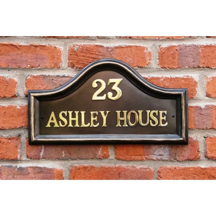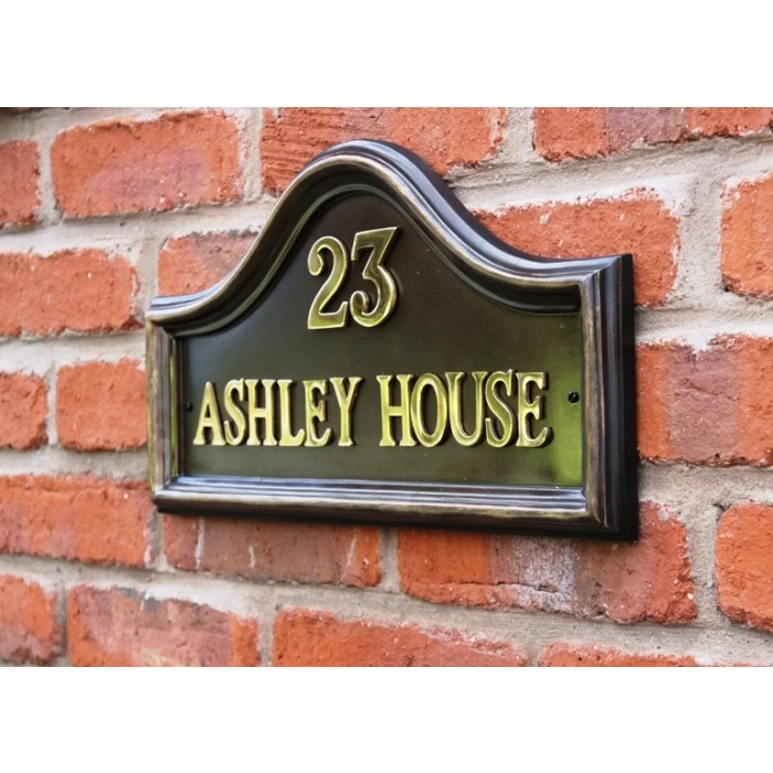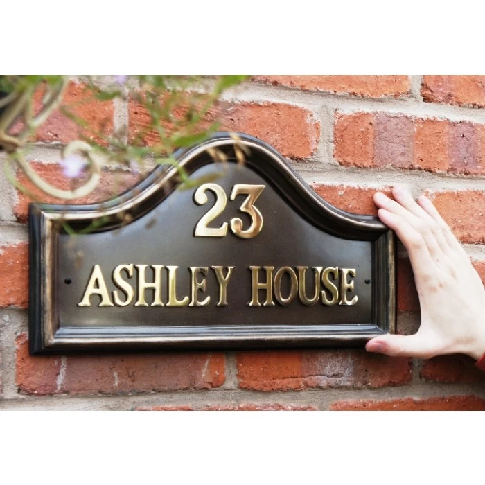 Traditional and elegant bronze finish house name sign. Illustrated with polished brass numbers and letters.