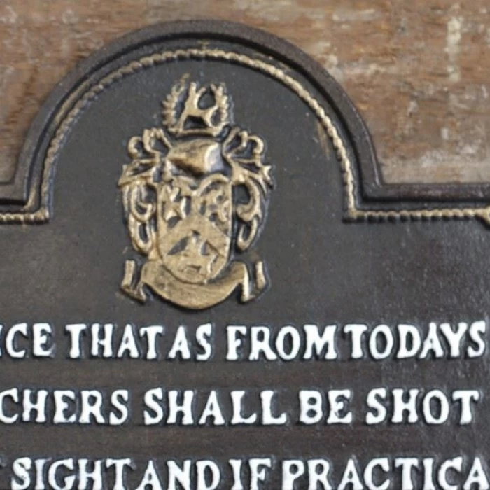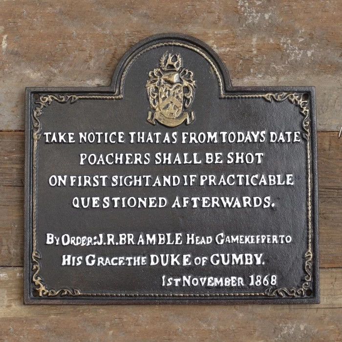Taking inspiration from traditional informative signs seen used throughout history, this solid cast iron sign will certainly add a touch of unique charm to your home or property. This ‘poachers’ sign features a detailed border and upper emblem finished in a rustic gold, as well as white lettering across its centre. This sign comes complete with for pre-drilled holes adorning each corner for simple and easy wall mounting.