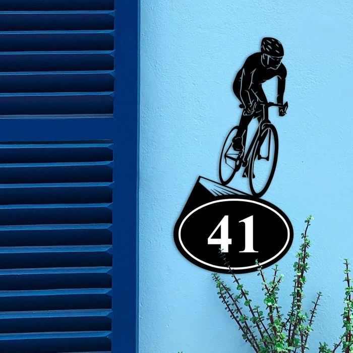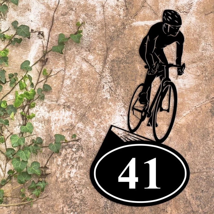 A unique way to add character to the exterior of your property throughout all months of the year, this detailed house number sign features the silhouette of a cyclist and their bicycle as they ride across an oval-shaped plaque. Expertly crafted from high-quality iron and finished in a sleek midnight black, this plaque comes complete with white contrasted numbers adorning its front. You can choose up to three numbers of your choice, making this sign perfect for adding both character and practicality to your home for many years to come.