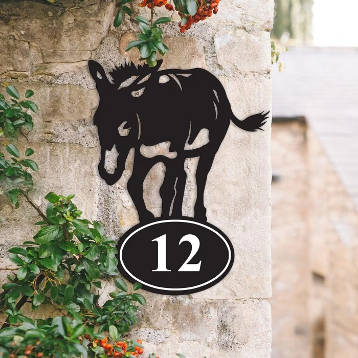 The donkey, a cousin of the horse, is a highly sociable animal which needs physical, mental and emotional attention. Depicted here on this house number sign, this donkey can be seen walking with head down, bushy tail swishing and hair down its neck. Created from high quality iron and finished in a midnight black finish, three large white numerals can be added to the oval sign to ensure homes and commercial areas are noticed from the road. A fantastic way to add nature and personality to the exterior of your home.