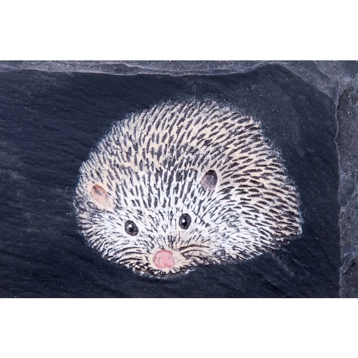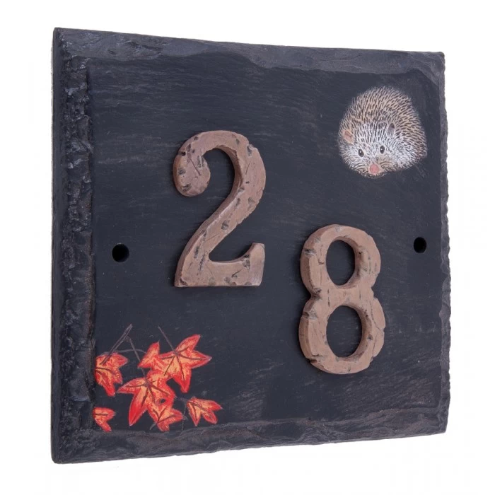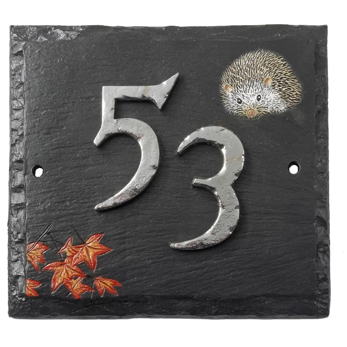This is a beautiful slate effect house number sign, features a charming hand painted hedgehog and elegant wild flowers. The sign is photographed with Rustic Chrome numbers.