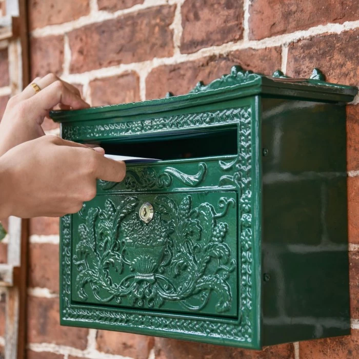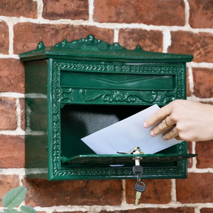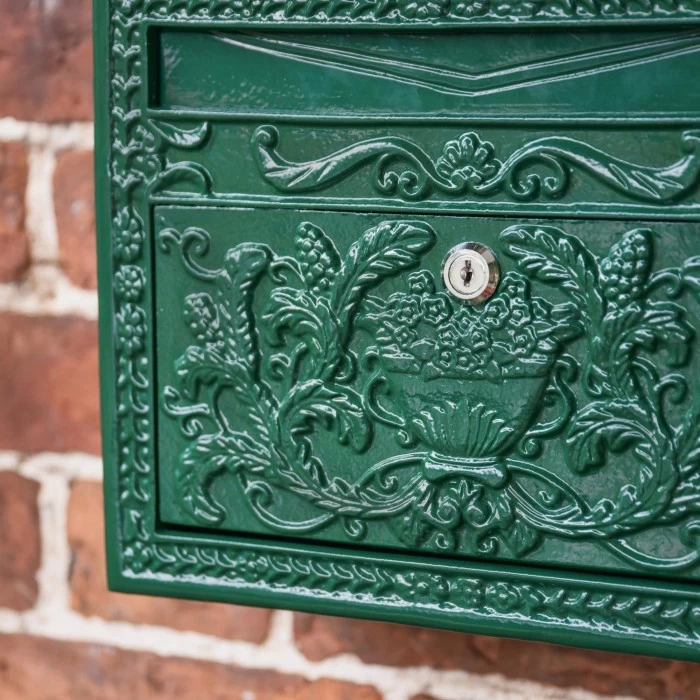 Crafted from a combination of high-quality steel & cast iron, and complete in a sleek green painted finish. This stunning post box is an example of a classic period piece, featuring exquisite detailing and pattern-work on the cast iron face of the post box. The sides are made from steel to reduce weight but are in a matching finish to bring the item to life. Also features a lockable front for easy and protected use.