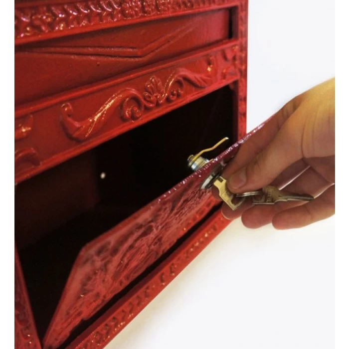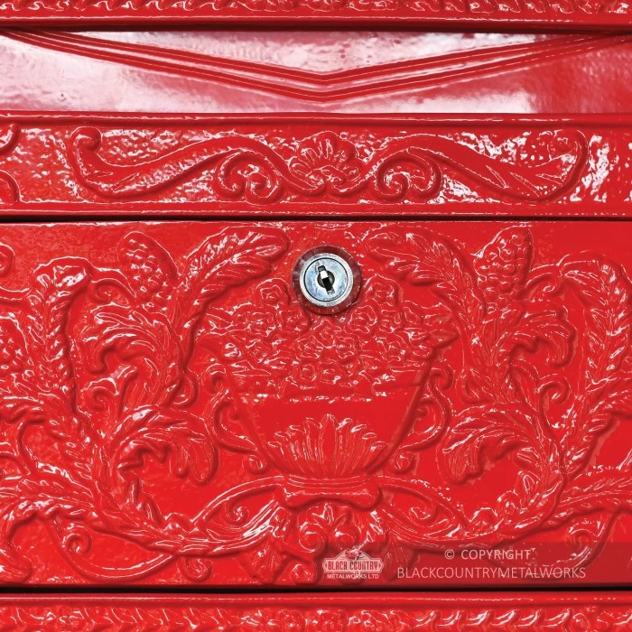 This is a fine example of a period post box, in a red iron finish. The lovely detailing on the front and top edging have been hand cast in high-grade iron, whilst the back and sides have been created in strong, fabricated, steel. Lockable front panel for easy emptying.