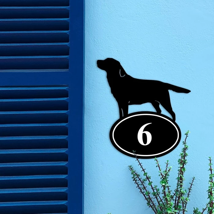 Designed and handcrafted in-house using thick iron, this quirky house number sign features the silhouette of a Labrador stood proudly atop an oval-shaped plaque. A must-have for those who love or own this intelligent and outgoing dog breed, this sign would add personality to your property exterior for many years to come. Finished in a sleek midnight black to complement your chosen outdoor space, this sign can be personalised with up to three numbers of your choosing.