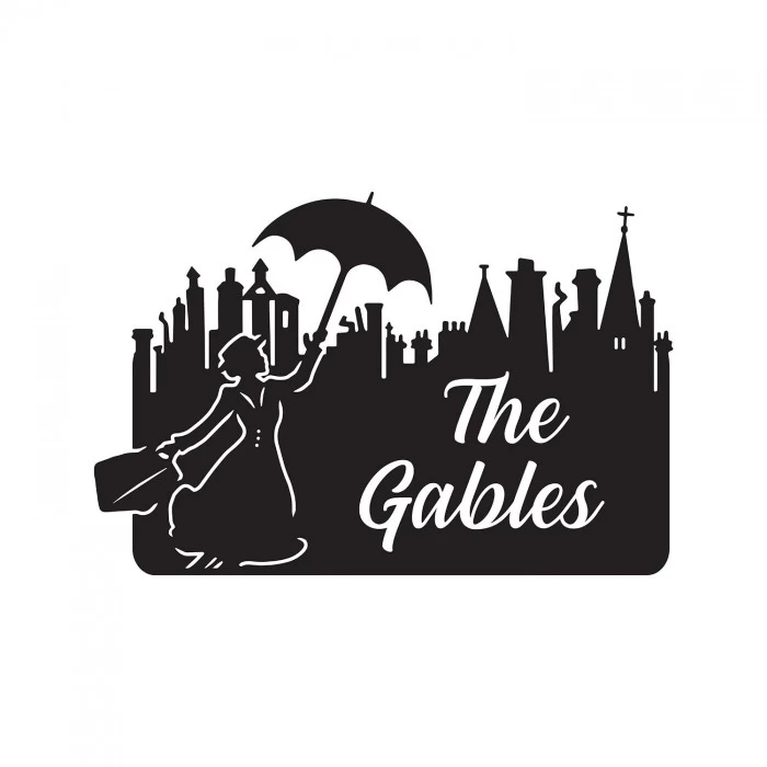 Expertly handcrafted from robust steel and finished in a sleek midnight black to complement any exterior setting, this unique house sign features the silhouette of Mary Poppins against the backdrop of a London skyline. Ideal for placement beside a door or entryway, this name sign has been designed in-house and would add unrivalled character to any home or property for many years to come. This sign is ready to be personalised with your house name in your choice of a contrasting gold, silver, or white finish. Simply use the drop-down boxes to select your desired font style and colour.