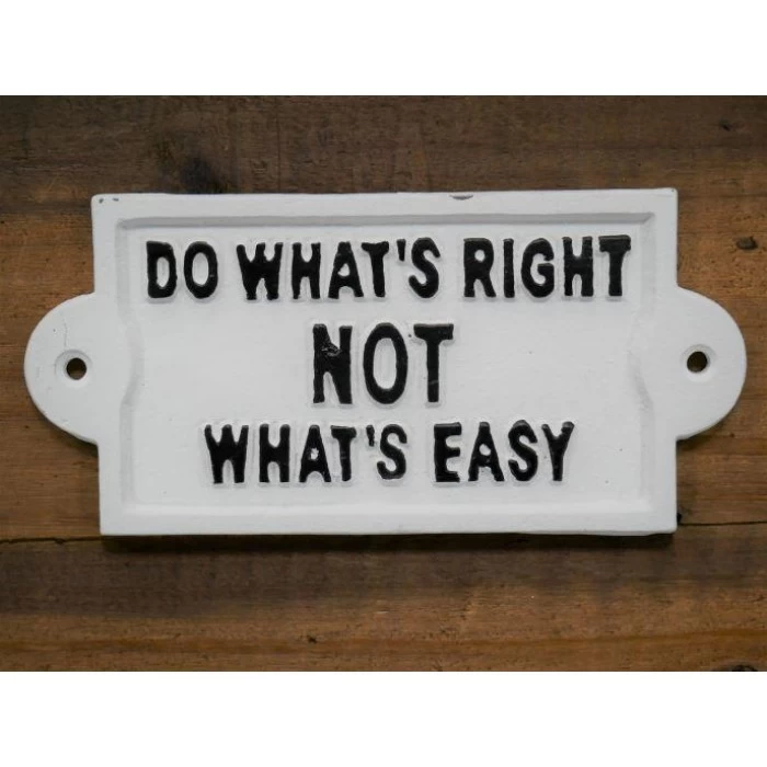 Handcrafted from robust cast iron and finished in a bold white effect, this unique sign would look ideal within any interior space and is the perfect daily life affirmation. Featuring contrasting black ‘DO WHAT’S RIGHT, NOT WHAT’S EASY’ lettering adorning its front, this sign would look perfect placed within an office, bedroom, or workshop setting. Complete with pre-drilled fixing holes for easy installation and use.