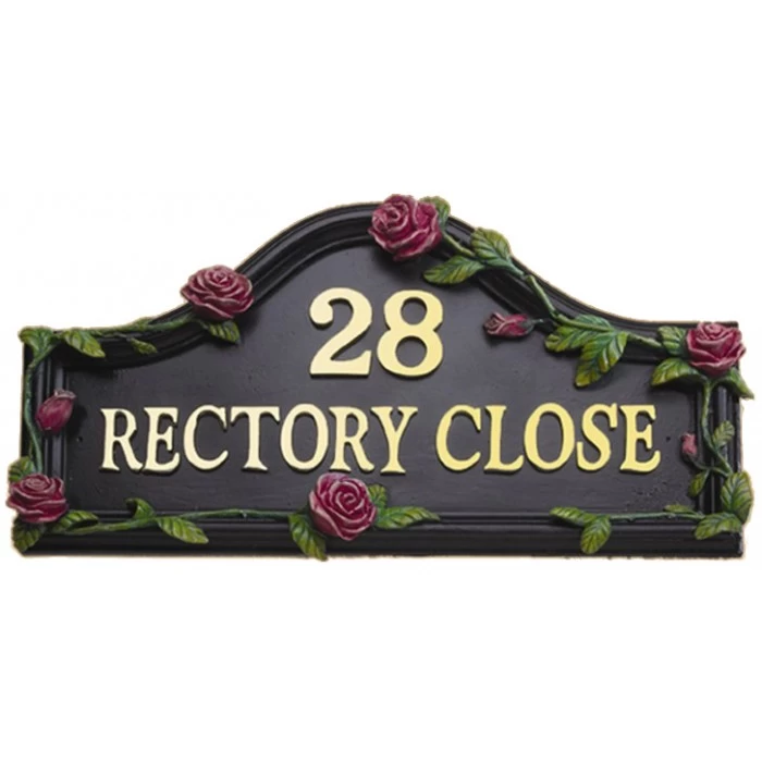Classically beautiful, this double sided plaque has been adorned with a frame of intertwined roses. The charming border has been hand painted in a delightfully rich pink and contrasting deep vine green. This elegant finish is the ideal complement to our polished brass and bright chrome lettering.