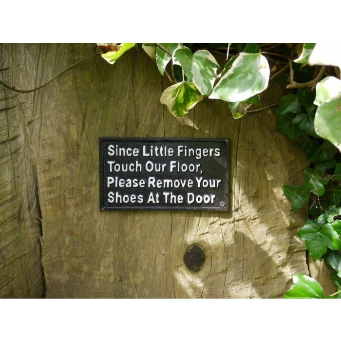 A must-have for any family home out there with younger children, this quirky sign is the perfect way to remind your guests and visitors to remove their shoes before entering your house. Handcrafted from robust cast iron and finished in a sleek midnight black with contrasting white lettering, this sign would look ideal fitted to any exterior wall or hallway space. Complete with four pre-drilled fixing holes for quick and easy installation.
