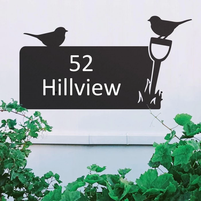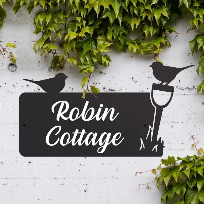 Designed and crafted by our in-house creative team, this gorgeous rectangular house name sign features two robins, one perched upon the name sign itself, whilst the other sits on a spade which has been placed into the ground. Crafted from high quality robust steel and finished in a sleek midnight black to complement any exterior setting, this house sign features pre-drilled holes for easy installation to the desired area. Ideal for placement on driveway columns or near front doors, this house sign will add a touch of nature and natural beauty to your home. Ready to be personalised with your house name in your choice of colours; gold, silver or white, this house name sign will add that touch of personality and character to your home.