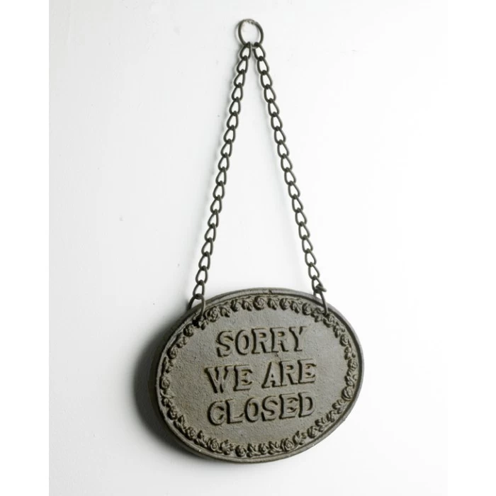 This “Sorry we are closed” hanging shop sign is produced from cast iron with a charmingly rustic finish.