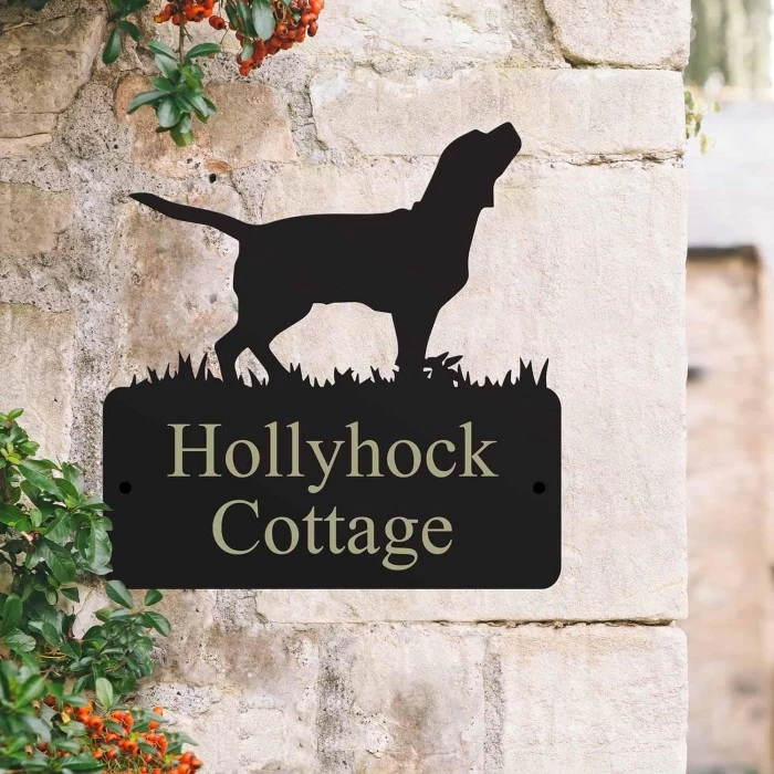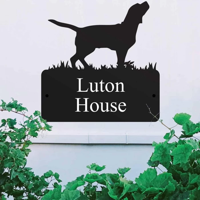 Highly detailed throughout its framework, this entirely unique house sign has been expertly crafted from thick steel and finished in a sleek midnight black to complement any property exterior. Featuring a design featuring a beagle acting playful, this house sign would look ideal placed against a brick or painted wall beside a door or entryway. A lovely way to show your love of dogs whilst adding unrivalled character to your home! This sign is ready to be personalised with your house name in your choice of a contrasting gold, silver, or white finish. Simply use the drop-down boxes to select your desired font style and colour.