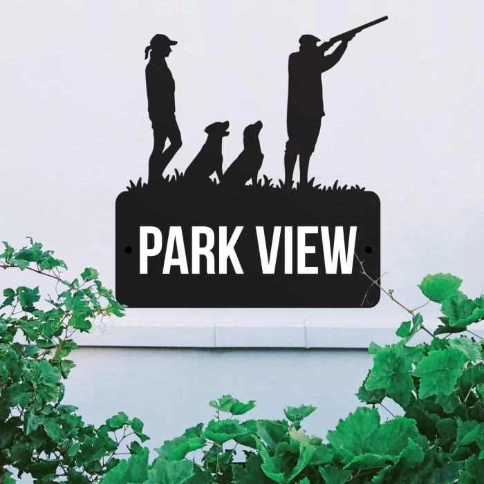 Highly detailed throughout its framework, this entirely unique house sign has been expertly crafted from thick steel and finished in a sleek midnight black to complement any property exterior. Featuring a design featuring a pair of labrador dogs sitting beside their owners on a hunt, this house sign would look ideal placed against a brick or painted wall beside a door or entryway. A lovely way to show your love of dogs and game hunting whilst adding unrivalled character to your home! This sign is ready to be personalised with your house name in your choice of a contrasting gold, silver, or white finish. Simply use the drop-down boxes to select your desired font style and colour.