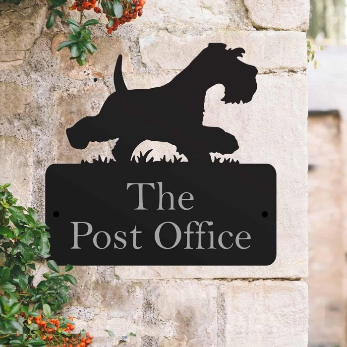 Highly detailed throughout its framework, this entirely unique house sign has been expertly crafted from thick steel and finished in a sleek midnight black to complement any property exterior. Featuring a design featuring a miniature schnauzer running, this house sign would look ideal placed against a brick or painted wall beside a door or entryway. A lovely way to show your love of dogs whilst adding unrivalled character to your home! This sign is ready to be personalised with your house name in your choice of a contrasting gold, silver, or white finish. Simply use the drop-down boxes to select your desired font style and colour.