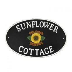 Featuring a beautifully hand-painted sunflower, this traditional oval shaped house name sign is the perfect way to christen a new property, or add a touch of something fresh and unique to an old one. Made from cast iron, this sign comes complete with your chosen lettering hand-painted to suit your preferences. Complete with two pre-drilled screw holes, this product is ready to be fitted wherever is desired.
