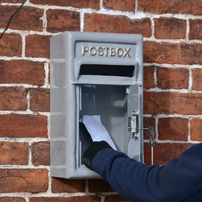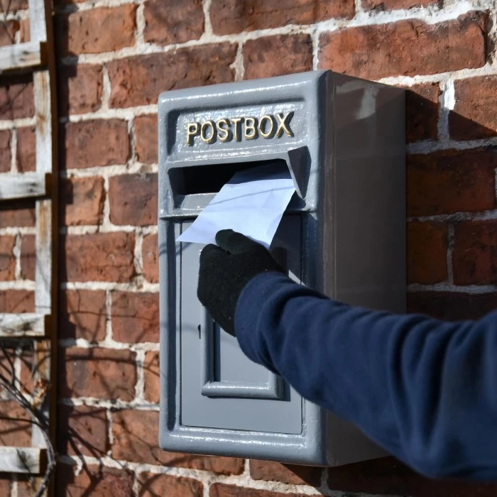 Crafted from a combination of robust steel and heavy duty cast iron, this post box is the ideal accessory for adding the exterior of your home. Finished in a modern grey with hand painted gold ‘POST BOX’ lettering, this post box features a wide hooded aperture to ensure mail remains safe and secure within. Designed to be mounted in a sheltered area and complete with a lockable door and pre-drilled holes in the back for easy installation. Supplied with two sets of keys.