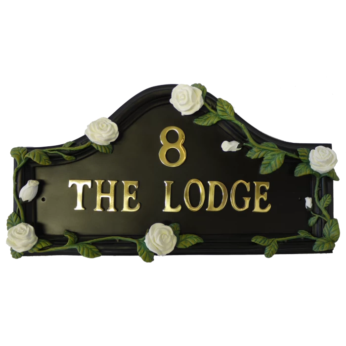 The epitome of elegance this design is framed by an enchanting border of hand painted roses. Each rose is finished in a beautifully crisp winter white, complimenting perfectly the polished black of the arched plaque.Â