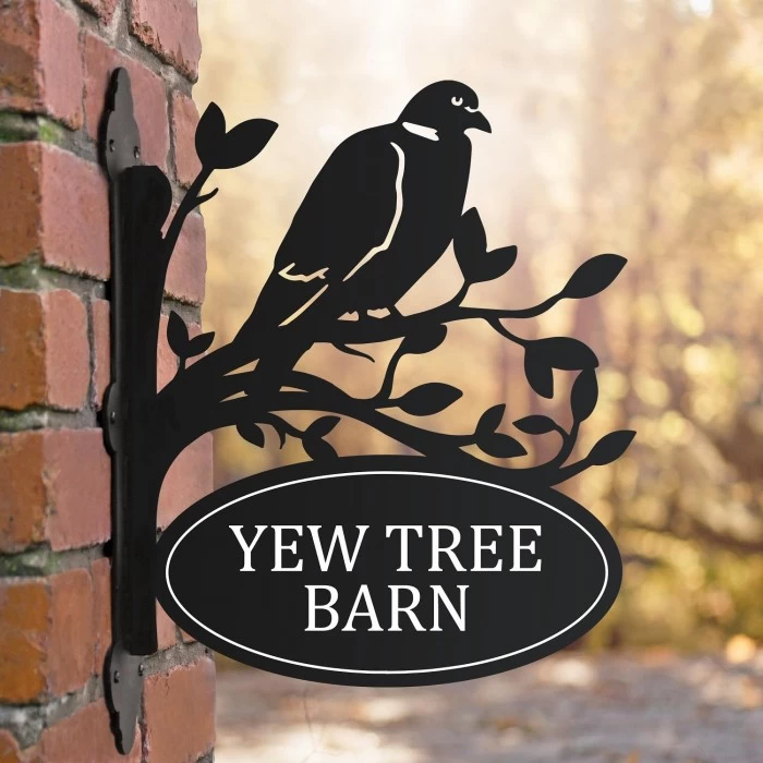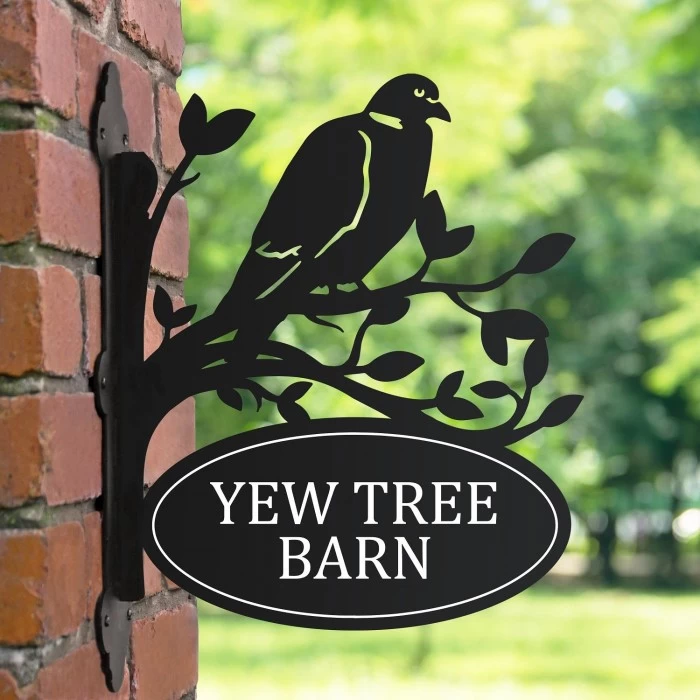 Crafted from high quality steel and finished in a sleek midnight black finish, this house name sign will certainly add another accent of charm and character to the exterior of your property. Depicting a wood pigeon perched upon several branches and leaves, the detailing adds a touch of natural style to any home, fence or column. The oval designed house sign can include any house name, street name or surname for ultimate personalisation. This house name sign comes complete with integrated wall mounted bracket which includes pre-drilled holes for easy installation to the desired location. To be in keeping with the overall design, this house sign name is only available in white vinyl in the Cambria font.